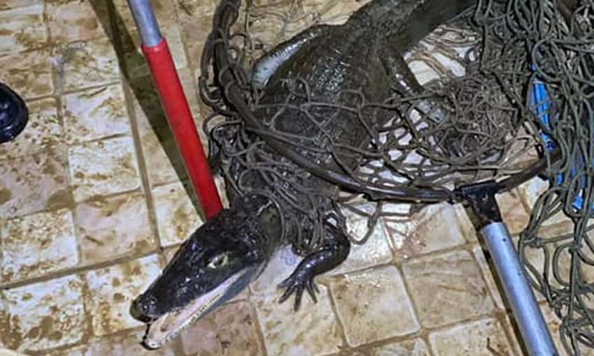 Bombeiros realizam resgate de jacaré em piscina de residência atingida pela alagação