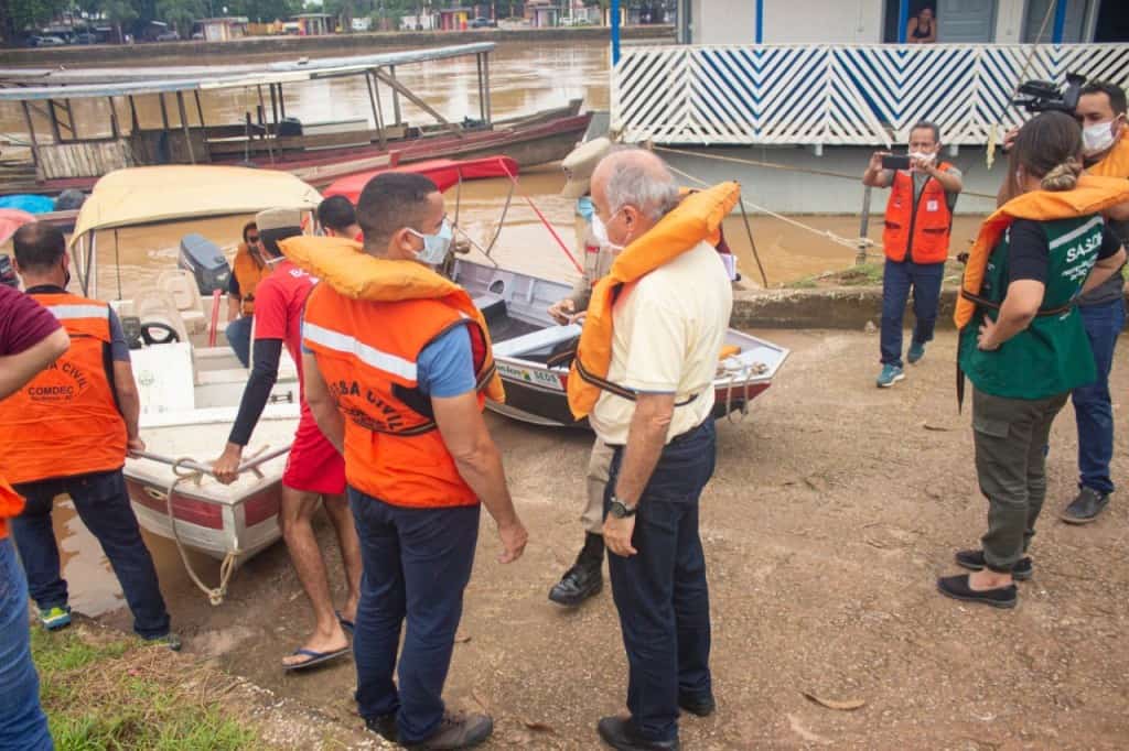 Bocalom e secretário nacional de Defesa Civil sobem rio Acre para ver situação da cheia nos bairros atingidos