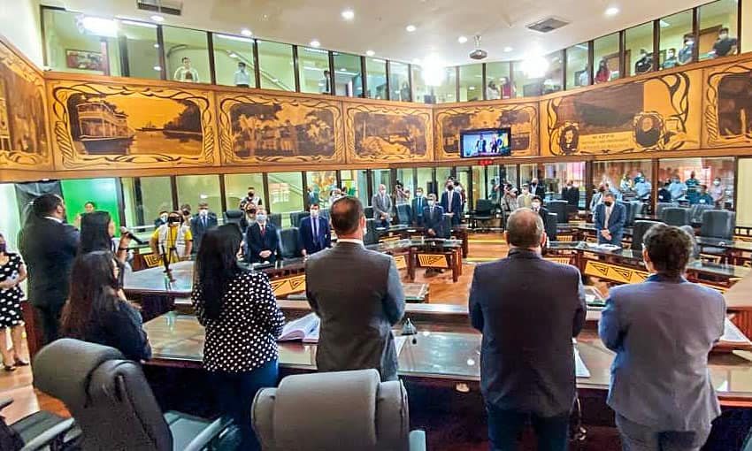 O presidente da Assembleia Legislativa do Acre, deputado Nicolau Júnior (PP), iniciou nesta terça-feira, 10, a primeira sessão presencial da casa após 511 dias de trabalhos suspensos em decorrência da pandemia de Covid-19. Durante esse período, as sessões do legislativo vinham ocorrendo apenas de forma virtual na plataforma de videoconferência Zoom. A sessão presencial contou com a execução do Hino Acre com a voz da cantora Ivana Pacifico, simulando uma abertura solene dos trabalhos.