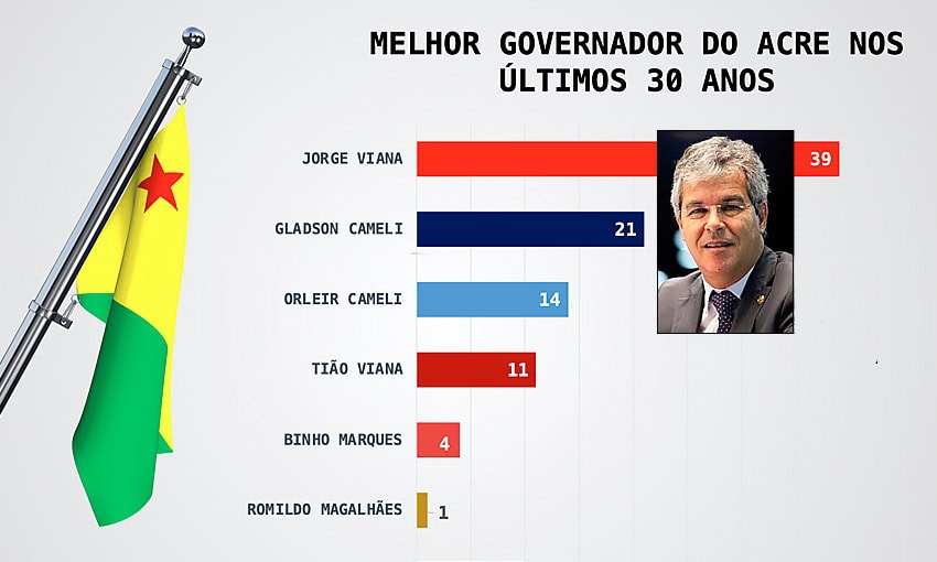 Enquanto Cameli é bem avaliado nos cenários estimulados, espontâneos e gestão, os números mostram que a memória do eleitorado acreano tem simpatia pelo ex-governador e ex-senador Jorge Viana (PT), Ele é apontado por 39% dos entrevistados como o melhor governador do Acre nos últimos 30 anos. Nessa amostragem, Gladson aparece com 21%, seguido por seu tio já falecido, o ex-governador Orleir Cameli que registrou 14%. O ex-governador Sebastião Viana registrou 11% e Binho Marques 4%. Romildo Magalhães registrou 1% e não souberam ou não responderam registraram 10%.