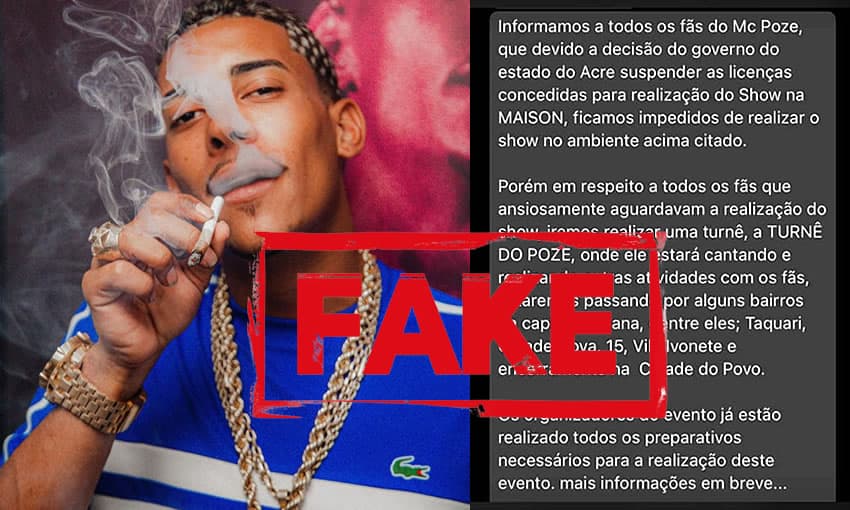 “Em respeito à todos os fãs que ansiosamente aguardavam a realização do show, iremos realizar uma turnê, a Turnê do Poze, onde ele estará cantando e realizando outras atividades com os fãs, estaremos passando em alguns bairros da capital acreana, dentre eles: Taquari, Cidade Nova, Quinze, Vila Ivonete e encerramento na Cidade do Povo”, diz a mensagem falsa compartilhada.