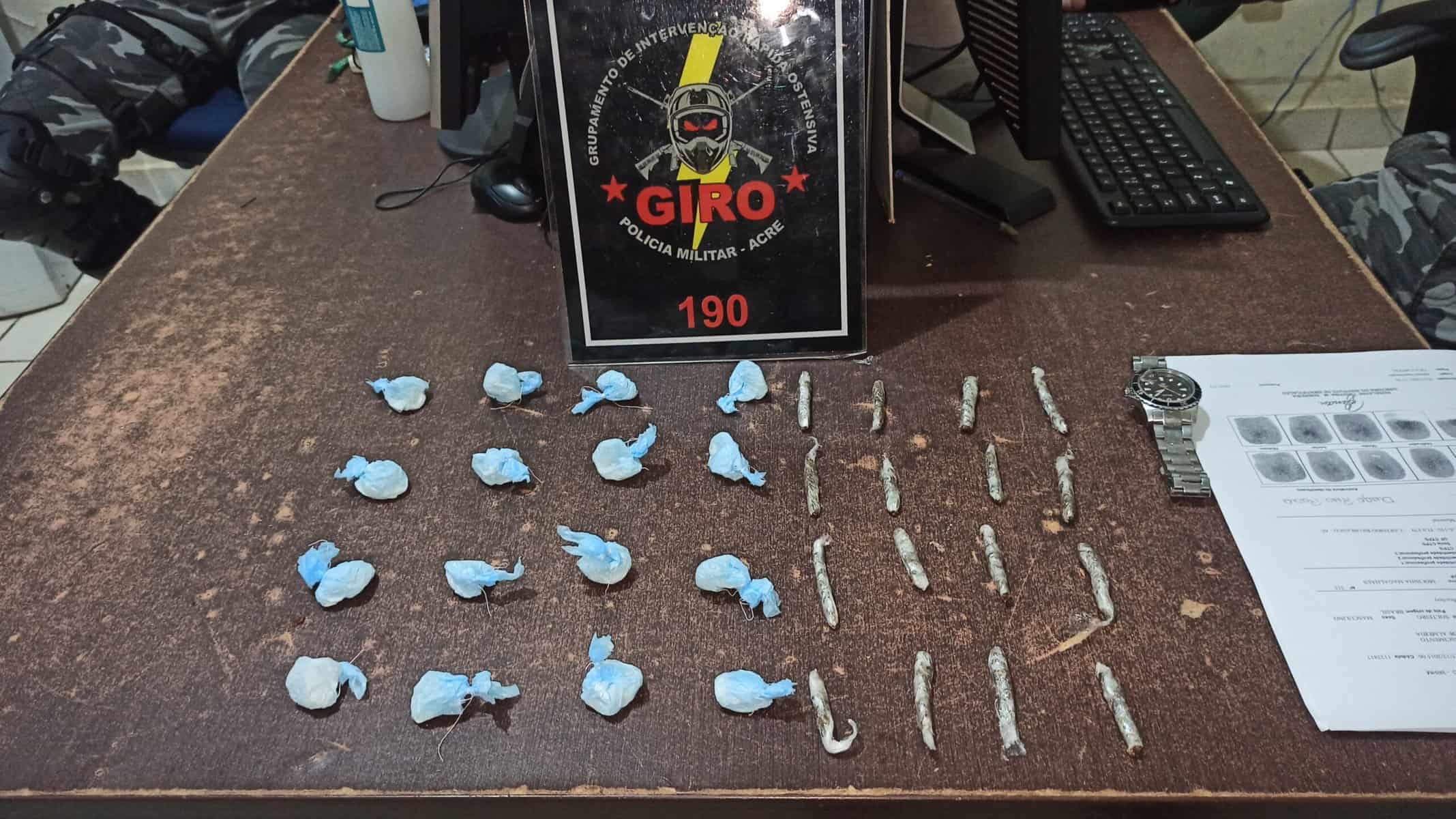 Uma ação do Policiais Militares do GIRO do Batalhão de Operações Especiais (BOPE) resultou na prisão de Carlos Gabriel Barroso de Souza, de 19 anos e Diego Reis Rosa, de 20 anos, na tarde desta quinta-feira, 18, pelo crime de tráfico de drogas. As prisões ocorreram no Beco da Pitanga, no bairro Mocinha Magalhães, em Rio Branco.