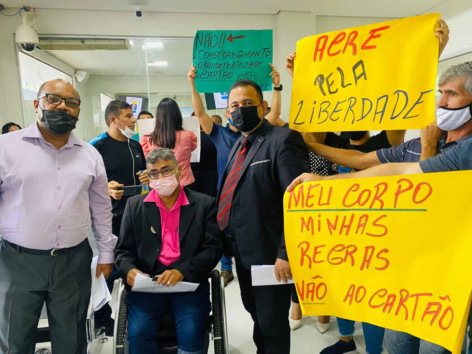 Com cartazes, manifestantes cobraram o fim do ‘passaporte da vacina’, decretado pelo governador Gladson Cameli (Progressistas). Em um dos cartazes, os manifestantes levam frases “Meu corpo minhas regras, não ao cartão”, ” Acre pela liberdade”, “liberdade ir e vir” e dentre outras.