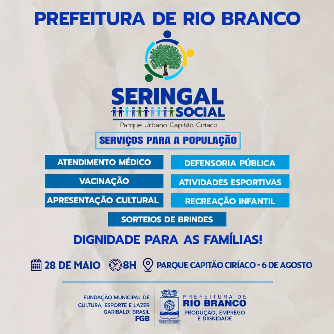 O evento intitulado ‘Seringal Social’ é direcionado para toda família. Haverá atendimento médico, defensoria pública, vacinação, atividades esportivas, apresentação cultural, recreação infantil, CRAS, entre outras.