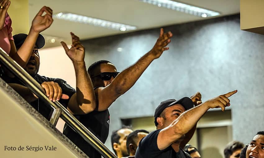 Nos corredores da Aleac, trabalhadores pró e contra a PEC protestam. A proposta deve ser votada em plenário ainda hoje. Policiais Penais que são contra a proposta chegaram a pegar exemplares da Constituição Federal e rasgaram, como ato de revolta.