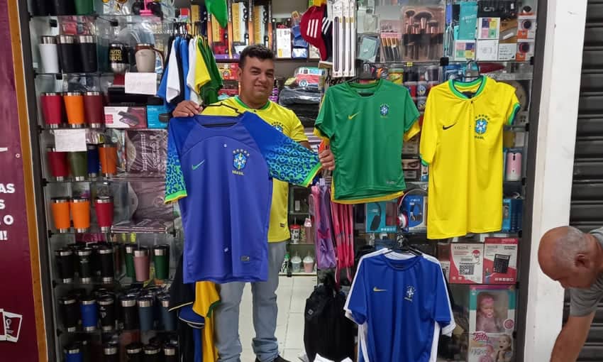 Ele conta que as vendas de camisa da seleção estão em alta desde a recente campanha eleitoral devido ao adeptos do presidente Jair Bolsonaro terem adotado a camisa da seleção como “farda”.