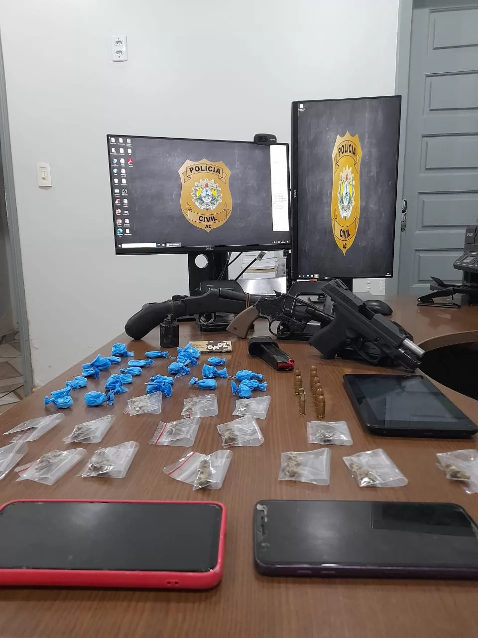 Durante o cumprimento dos mandados, os policiais encontraram 03 armas de fogo, sendo uma pistola, uma escopeta e um revólver, além de munições. Ademais, foram apreendidas uma quantidade razoável de drogas, tipo maconha e cocaína.