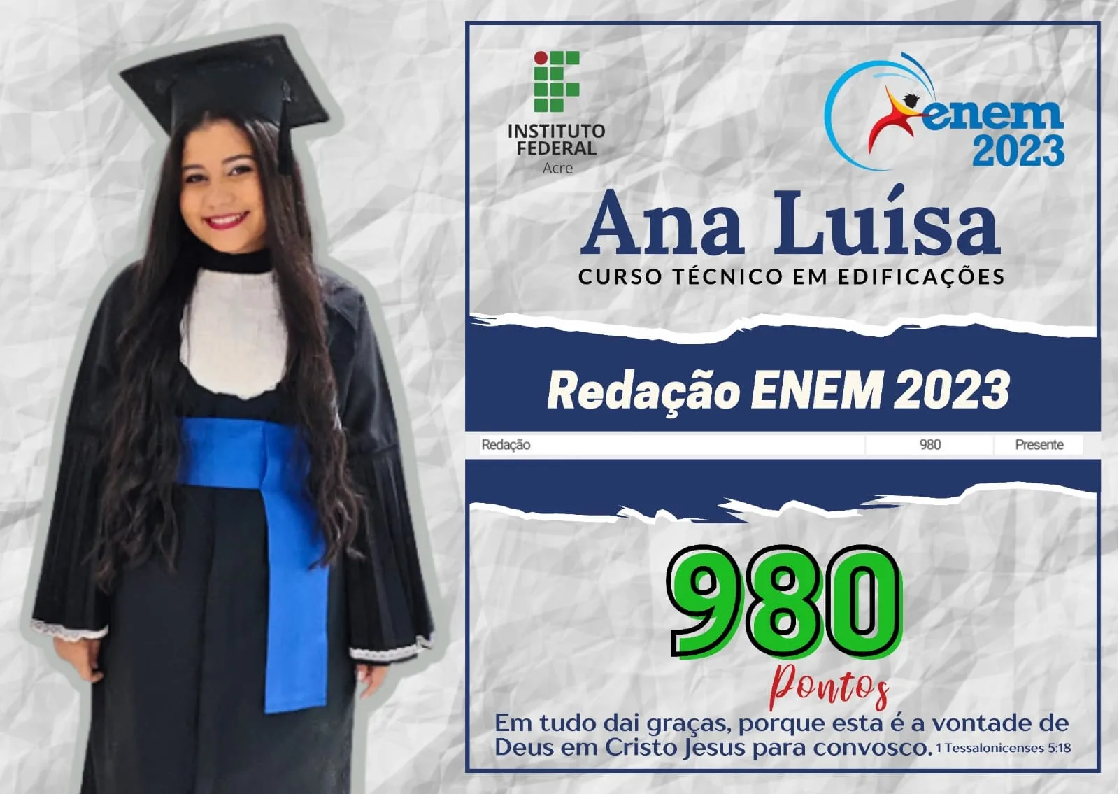 Ana Luísa Melo é só felicidade. A jovem acreana de 18 anos que sempre estudou em escola pública tirou 980 na redação do Enem 2023. Formada no ensino médio pelo Instituto Federal do Acre (IFAC), conta que a nota é resultado de muito estudo.
