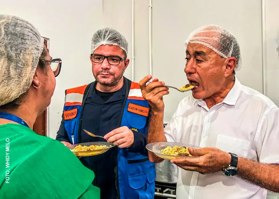 O governador Gladson Cameli e o prefeito de Rio Branco, Tião Bocalom, visitaram juntos o Parque de Exposições Wildy Viana, que funciona como abrigo para os atingidos pela cheia do rio Acre. Juntos, os chefes dos poderes executivos estadual e municipal tomaram café e almoçaram na cozinha comunitária do abrigo, onde se serviram com arroz, macarrão, farinha e carne guizada.