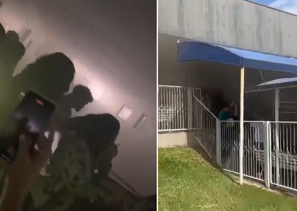 Nos vídeos, é possível verificar a correria dos adolescentes que tentam deixar o prédio.