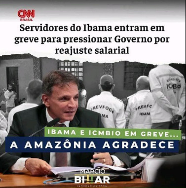 Recentemente, o senador Marcio Bittar (União) ironizou nas redes sociais a declaração de greve pelos servidores ambientais federais em todo o país. Compartilhando notícias de jornais sobre o movimento, o parlamentar postou: “o agronegócio agradece e pede que não dure muito. Só uns 10 anos tá bom”. Em janeiro, ele já havia provocado: “Ibama e ICMBio em greve… a Amazônia agradece”.