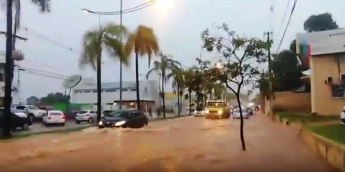 A avenida Ceará, uma das mais movimentadas de Rio Branco, no trecho em frente ao Palácio do Comércio, ficou completamente inundada na tarde desta terça-feira, 10.